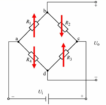 称重传感器模块上下表面各有一个应变片,每个应变片内有 2 个压力电阻。一共为 4 个压力电阻,组成全桥式电路。全桥电路可以提高所测的精度,而且电桥本身也能实现自补偿(温度补偿)。